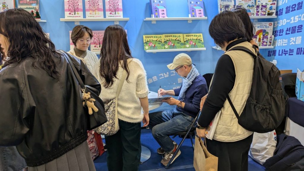 湯姆牛是大會邀請,他在韓國有十本書出版。他的《最可怕的一天》榮獲韓國小學一年級優良推薦讀物,這兩天在不同出版社展位上辦活動,匯集了許多粉絲來簽名。