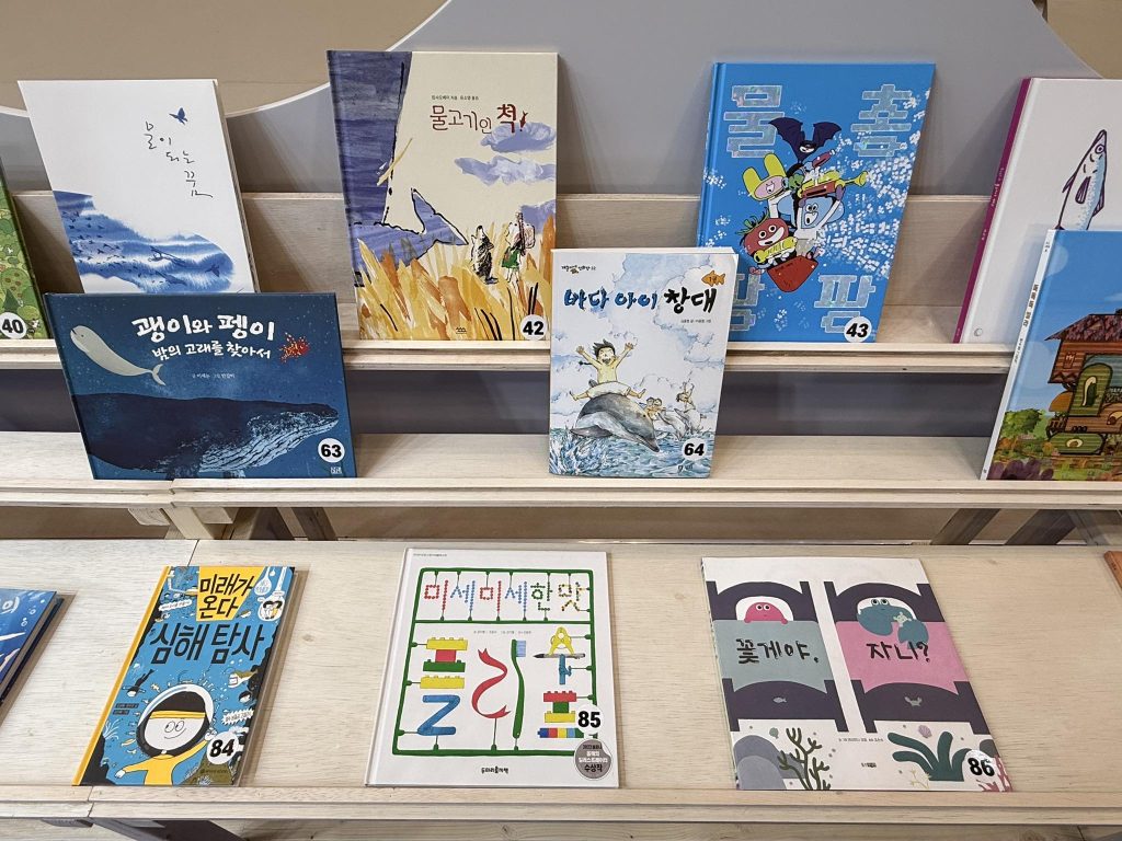 在主題館裡看到書的波浪中有不少翻譯的台灣繪本。