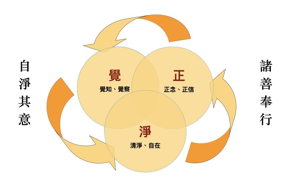 而「覺」、「正」、「淨」這三者是連環的,相互呼應的。