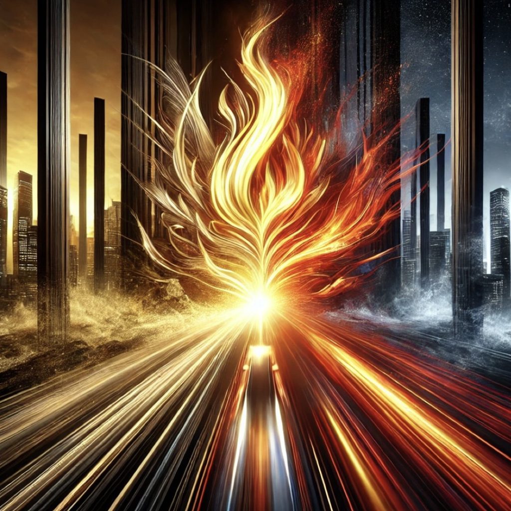 「然而,大火之後,必有餘燼與光暈。歷經一輪火光炫目的狂歡,人們開始學會在光中尋找自己的節奏。智慧不再只是外顯的聲量,而是能在熱浪中守護一份內在的寧靜。